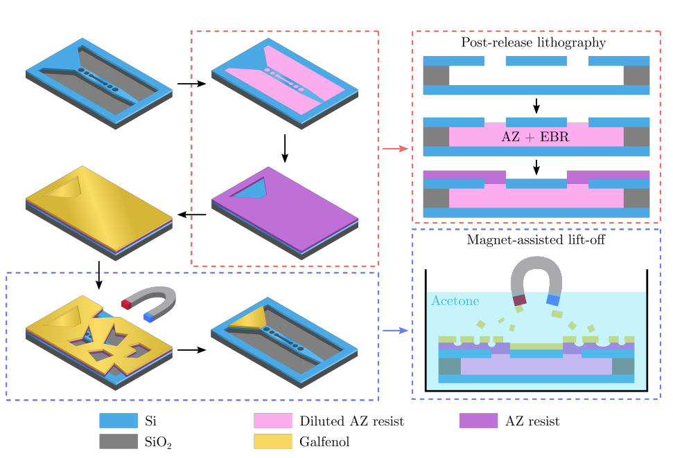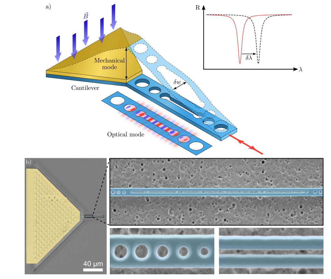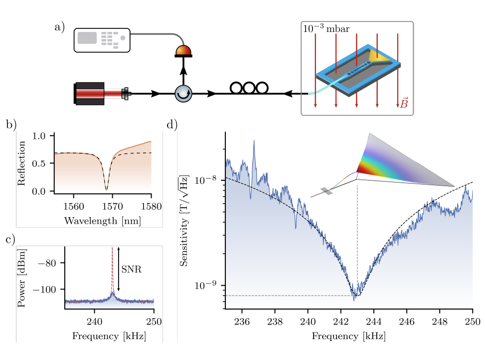 Optomechanical sensors enable exquisitely sensitive force measurements, with emerging applications across quantum technologies, standards, fundamental science, and engineering. Magnetometry is among the most promising applications, where chip-scale optomechanical sensors offer high sensitivity without the cryogenics or magnetic shielding required by competing technologies. However, lack of compatibility with integrated photonics and electronics has posed a major barrier. Here we introduce silicon-on-insulator optomechanical magnetometers to address this barrier. A new post-release lithography process enables high-quality metallisation of released mechanical structures, overcoming the incompatibility between silicon-on-insulator fabrication and functional magnetic films. This allows us to employ photonic-crystal cavities that enhance motion-to-optical signal transduction by over an order of magnitude. The resulting devices achieve magnetic field sensitivity of 800 pT Hz^-1/2, three orders of magnitude beyond previous waveguide-integrated designs. The advances we report provide a path towards high-performance, room temperature and chip-integrated magnetometers for applications ranging from biomedical imaging and navigation to resource exploration.