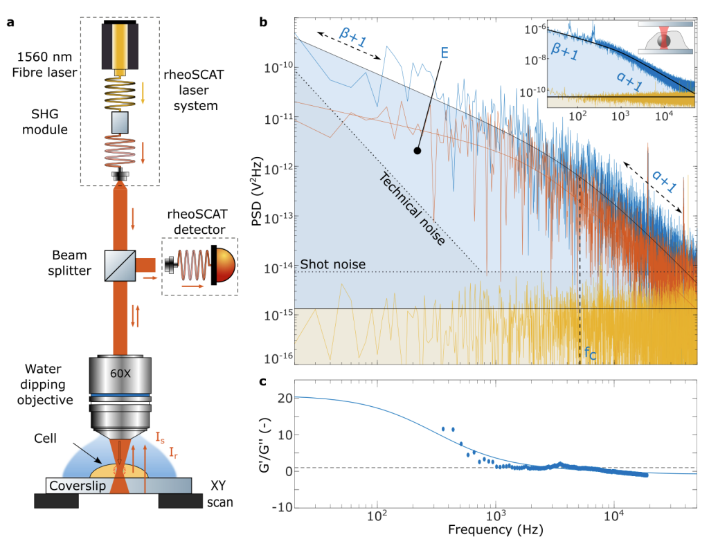 Many essential cellular functions depend on the viscoelastic properties of the cytoplasm. While techniques such as optical tweezers and atomic force microscopy can measure these properties, their reliance on localized probes prevents intracellular imaging and perturbs native cellular behaviour. Label-free microscopy offers a non-invasive alternative for observing intracellular dynamics. However, limitations in signal-to-noise ratio and imaging speed typically restrict analysis to diffusivity, leaving cellular viscous properties inaccessible. Here, we introduce rheoSCAT, a label-free, phase-sensitive microscope engineered with ultra-low phase noise. This system enables measurements of intracellular dynamics at frequencies up to 50 kHz, twenty times faster than previous label-free approaches. Applied to live cancer cells, this technique establishes a connection between label-free microscopy and rheology. The high speed of our technique reveals viscoelastic behaviours that were previously inaccessible, which we show are consistent with probe-based microrheology observations. The rheological images produced distinguish intra- and extracellular regions with high contrast, resolve spatial variations in cellular mechanics, and enable monitoring of cellular state and stress over time. The ability to quantitatively map intracellular energetics and viscoelasticity offers a powerful tool for advancing fundamental cell biology, cancer research, clinical diagnostics, and drug development.
